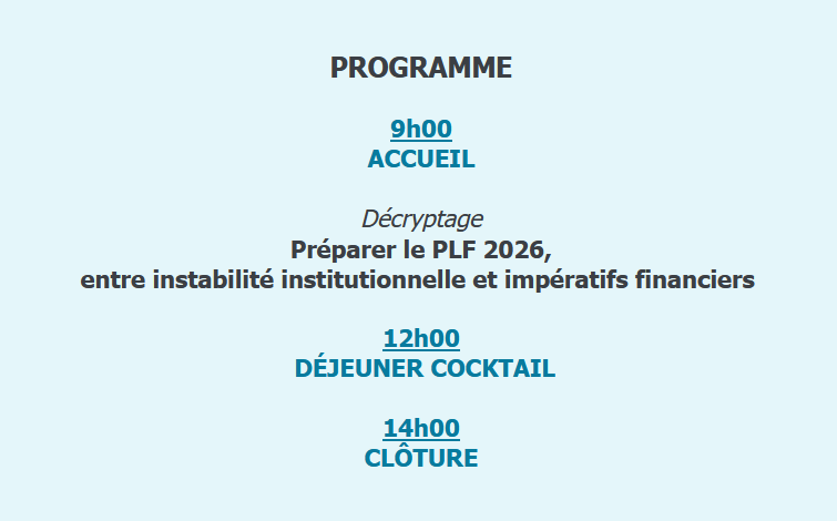 Cette matinée d’étude sera consacrée à la préparation des budgets 2026 dans un contexte politique et institutionnel extrêmement instable et incertain, puis se conclura par un déjeuner-cocktail.
